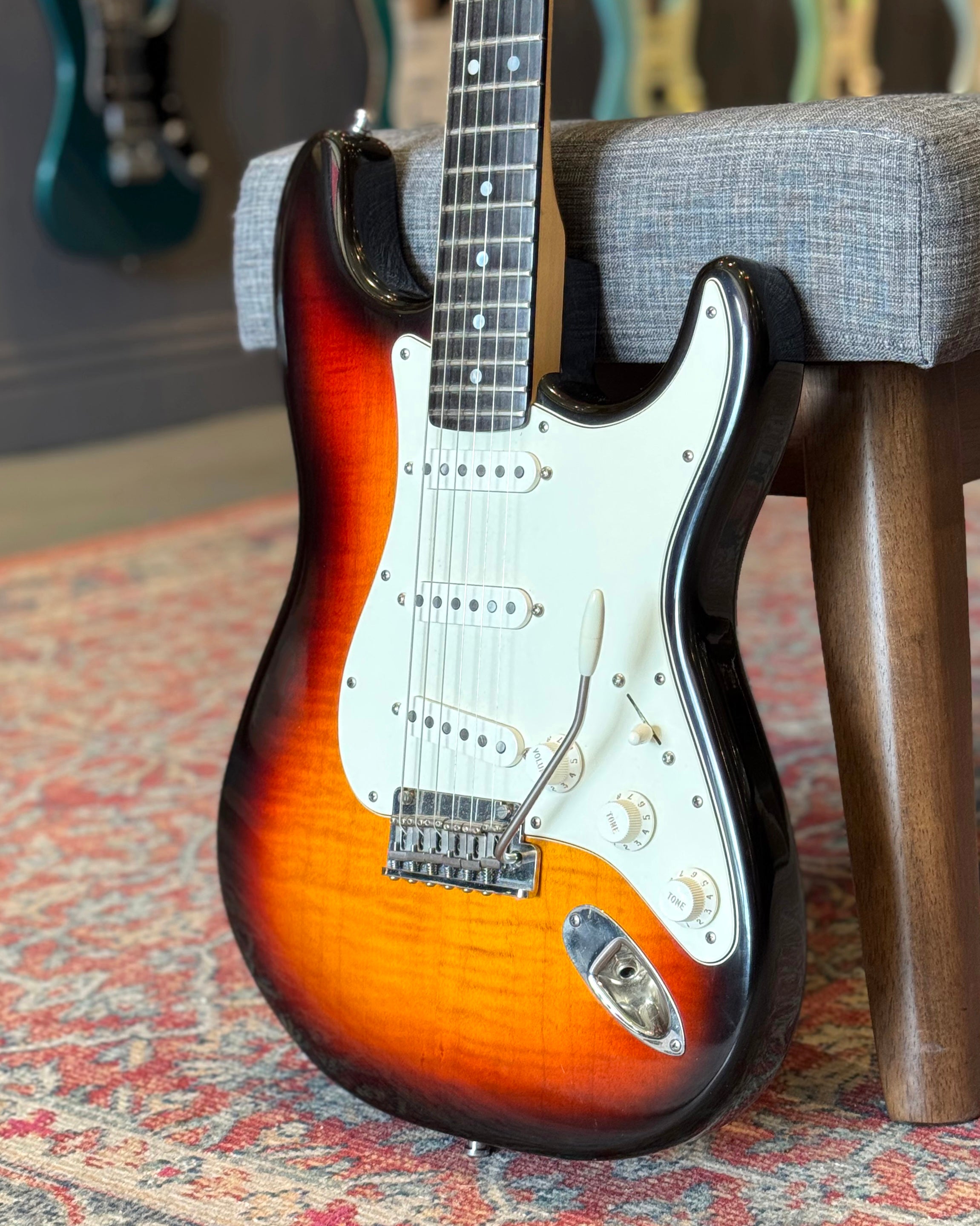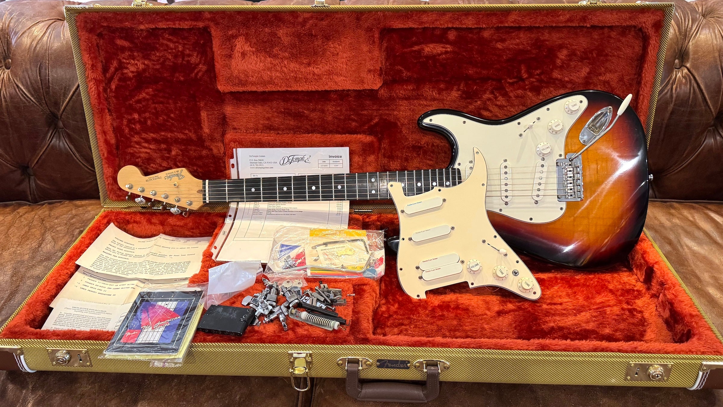 One owner 1990 Fender Strat Ultra in excellent condition. Electronics, tremolo system and nut has been replaced with modern parts by Michael DeTemple of DeTemple guitars. Original loaded pickguard with Lace Sensors, original roller nut and original tremolo system are included in the case. Comes in a Fender Tweed hardshell case with Guitar Center receipt from 1991, manuals and hang tags.