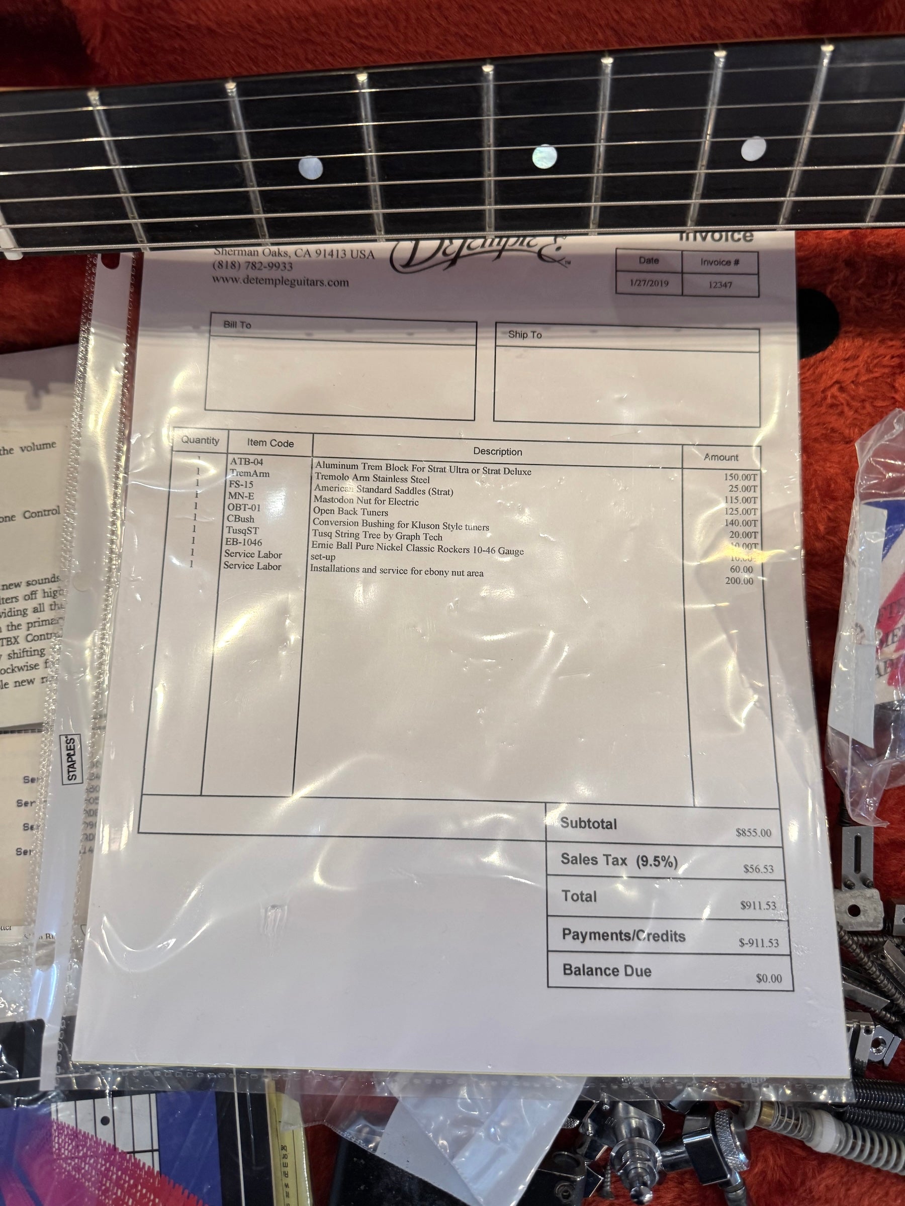 Pickups: DeTemple pickups (original Blue, Silver and 2 x Red Lace Sensors included mounted to original pickguard with electronics)